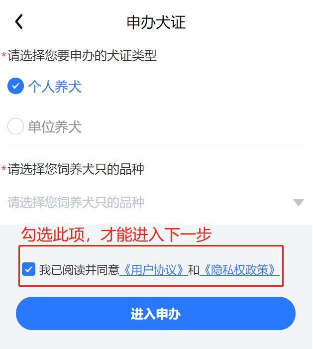第四步:点击【申办犬证】,选择犬证类型及品种,点击【进入申办】,阅读完毕,点击【继续】