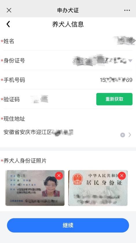 第五步:按提示填写养犬人信息或养犬单位信息,点击【继续】