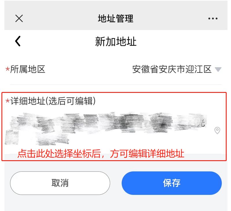 2、填写地址项时,新增地址先选择详细地址坐标后,方可编辑地址。