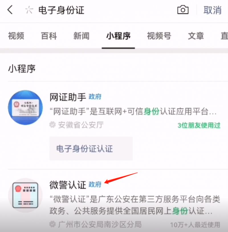 1、打开微信。点击右上角的放大镜。在搜索框里面,我们输入电子身份证,点击搜索。在分类当中选择小程序。往下滑动,这里我们找到微警认证,在微警认证的旁边,有一个政府的字样,说明可以放心使用。