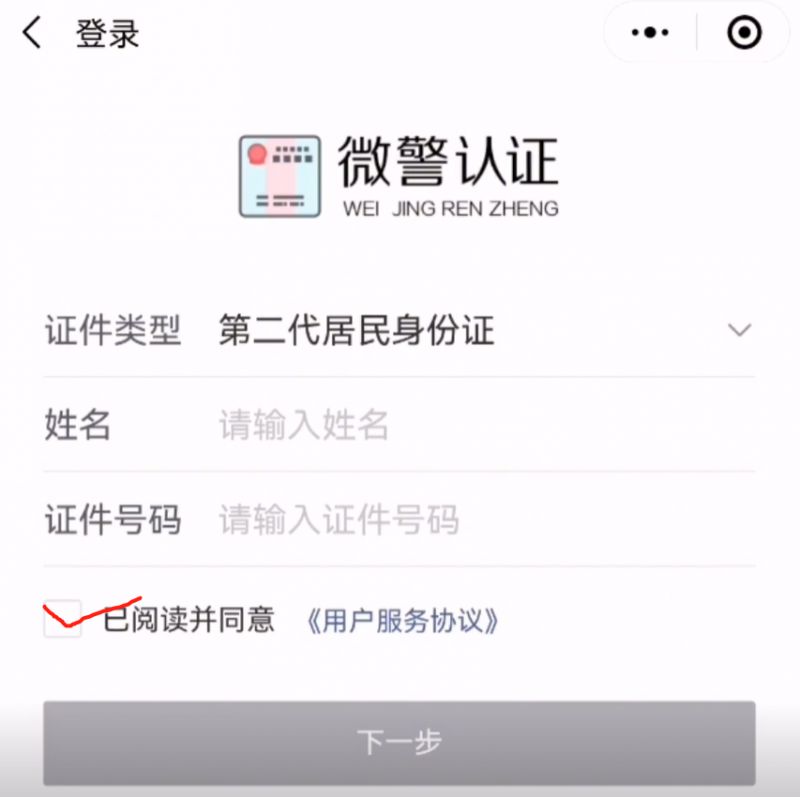 2、登录。点击登录,输入一下姓名,身份证号码,最后勾选一下左下角的方框,点击下一步。点击允许。