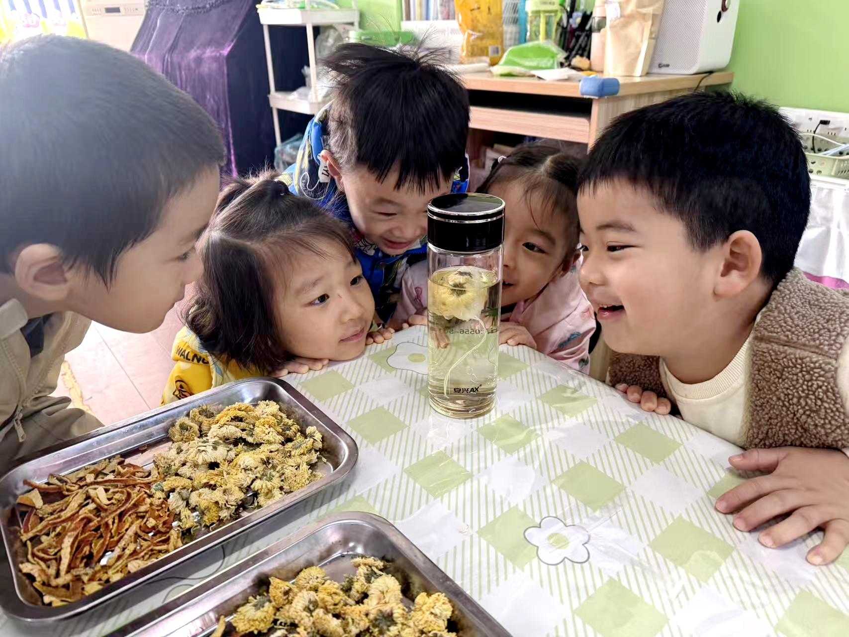 橘皮的惊喜并未止步,老师带领孩子们仔细刨去橘皮内侧的白瓤,将处理干净的橘皮切成细细的丝,整齐地铺在竹筛上晾晒。待橘皮丝干燥后,孩子们又小心翼翼地将其与干燥的菊花、晶莹的冰糖一同装入茶包袋,亲手制作出了独一无二的“橘皮菊花茶饮包”,孩子们围在桌边,好奇地看着老师将茶饮包放入茶杯,倒入热水,随着热水冲泡,淡淡的清香渐渐弥漫开来,孩子们忍不住凑近闻了又闻,露出了开心的笑容,说“这就是秋天的味道呀!”